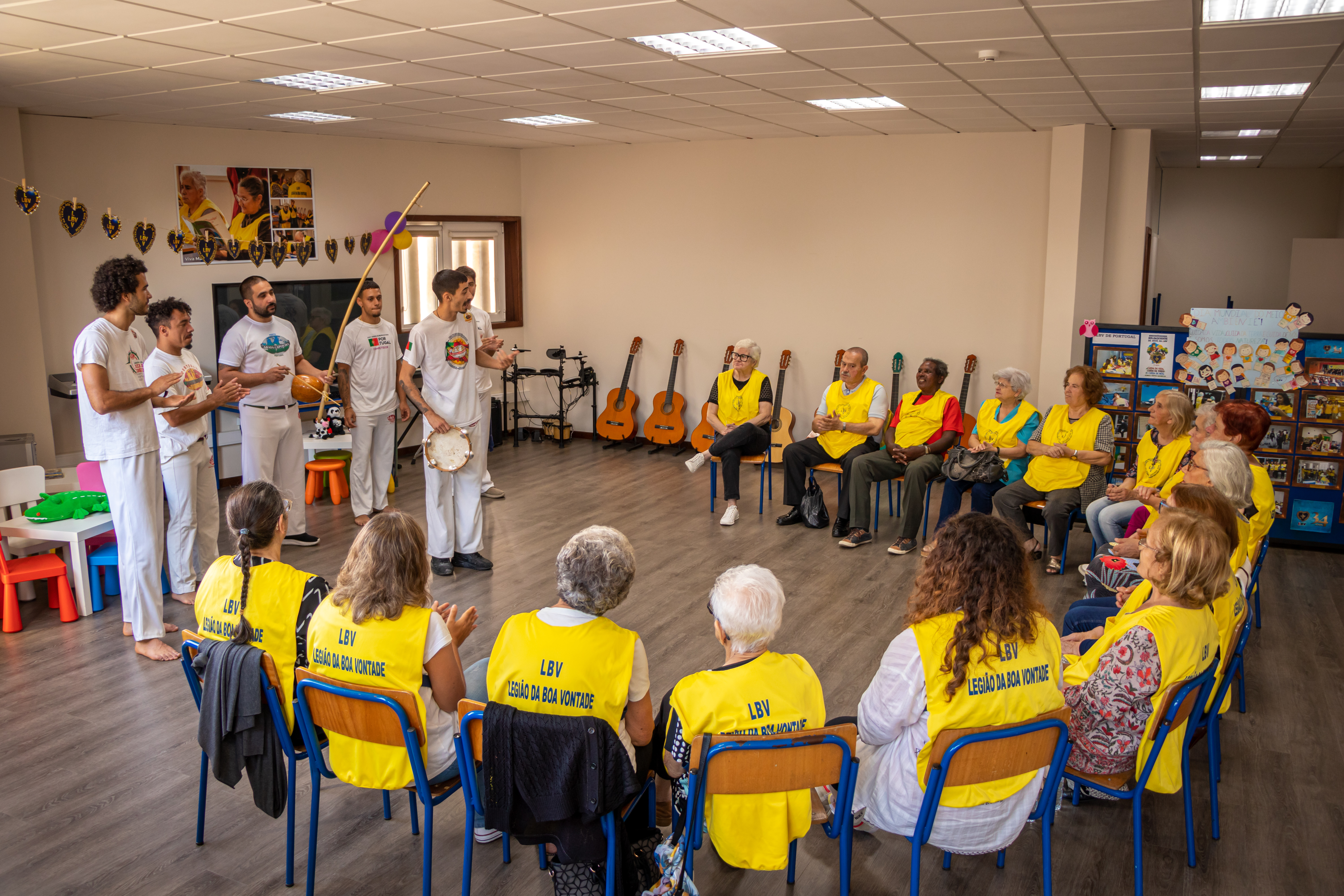 César Vale e integrantes da Escola de capoeira Abada Porto estiveram a partilhar conhecimento, músicas e atividades da capoeira. Uma iniciativa muito bem-recebida por todos na Legião da Boa Vontade.