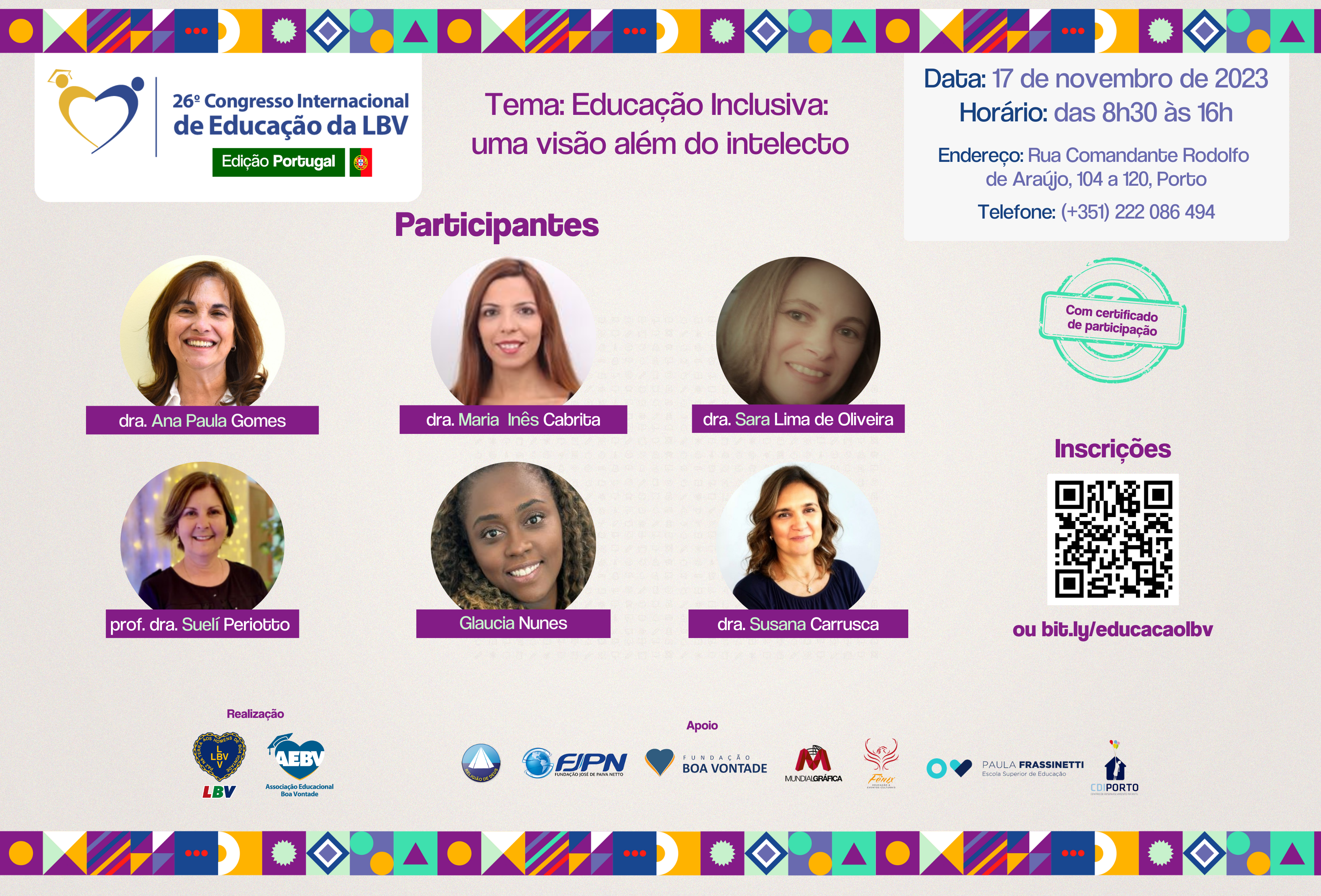 O 26º Congresso Internacional de Educação da LBV, ocorre dia 17 de novembro de 2023, na cidade do Porto, Portugal, com o tema: “Educação inclusiva: uma visão além do intelecto”. A iniciativa tem como objetivo contribuir para a formação continuada de docentes, discentes, pesquisadores, profissionais de áreas ligadas à Educação, estudantes, pais, todos os que de alguma forma sentem e sabem a importância da educação para todos nós. O encontro visa compartilhar estratégias educacionais que possam ser direcionadas a estudantes com diagnósticos, a fim de se alcançar a equidade, uma vez que todos somos únicos nas nossas diferenças, mas igualmente necessitados de atenção ao ritmo e capacidade que trazemos como potencial pessoal. Nesse sentido, o evento apresentará contribuições e experiências de especialistas em práticas inclusivas, pensando juntos em como devemos agir em sala de aula, em situações geralmente muito diversas. É preciso ter em conta as dificuldades de aprendizagem enfrentadas por crianças e adolescentes, considerando os seus aspetos físicos e cognitivos, e ainda dialogar sobre caminhos que levem apoio a alunos sobredotados, que podem não adaptar-se ao ensino dito “normal”. A palestra de abertura será ministrada por Suelí Periotto, doutora e mestre em Educação pela Pontifícia Universidade Católica de São Paulo, superintendente educacional e supervisora da linha pedagógica aplicada na rede de ensino da Legião da Boa Vontade que abordará as boas práticas do Programa LBV -— Potencializando Habilidades, que orienta professores para o desenvolvimento pedagógico de estudantes com distúrbios de aprendizagem e diagnósticos diversificados.
