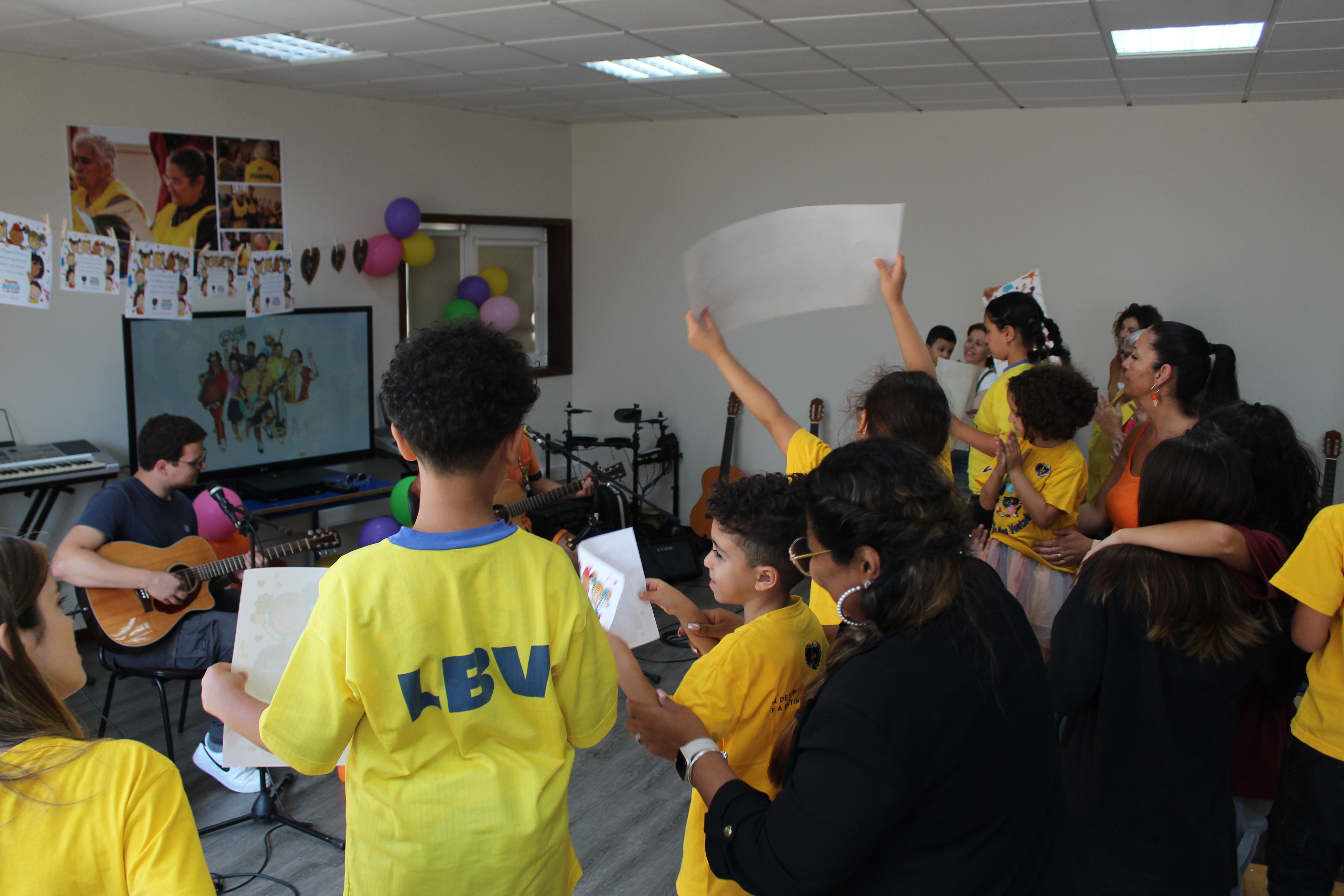 Muita música, fotografias, autógrafos, não faltando as lembranças que as crianças preparam, cartazes com agradecimentos, para os músicos que voltaram agora a estar com as crianças do Programa Semente da Boa Vontade!