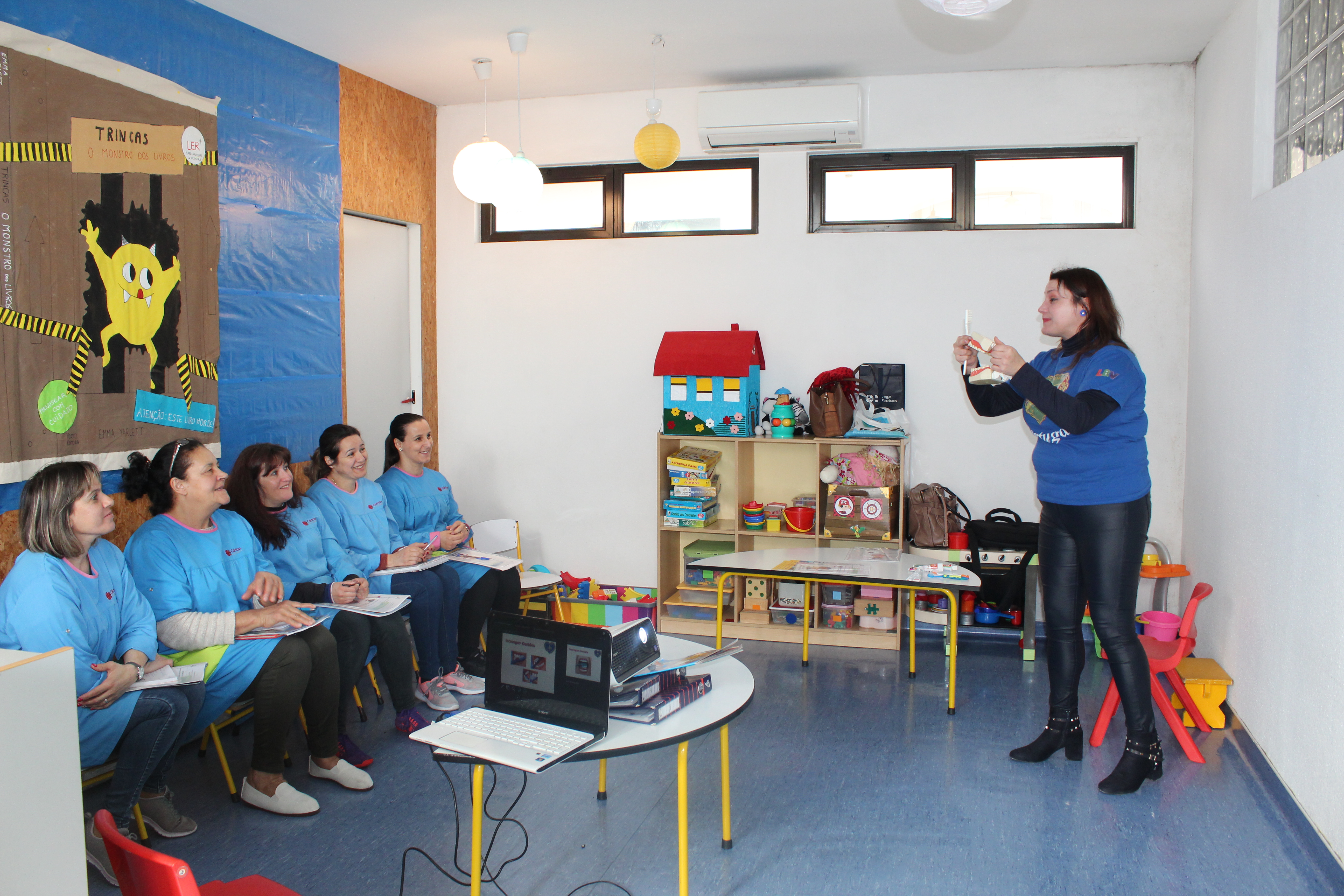 Como realizar uma correta escovagem dos dentes das crianças, alimentação, cuidados com a saúde foram alguns dos temas abordados junto dos colaboradores deste Jardim de Infância que recebe, durante o ano, o Programa Sorriso Feliz da LBV.