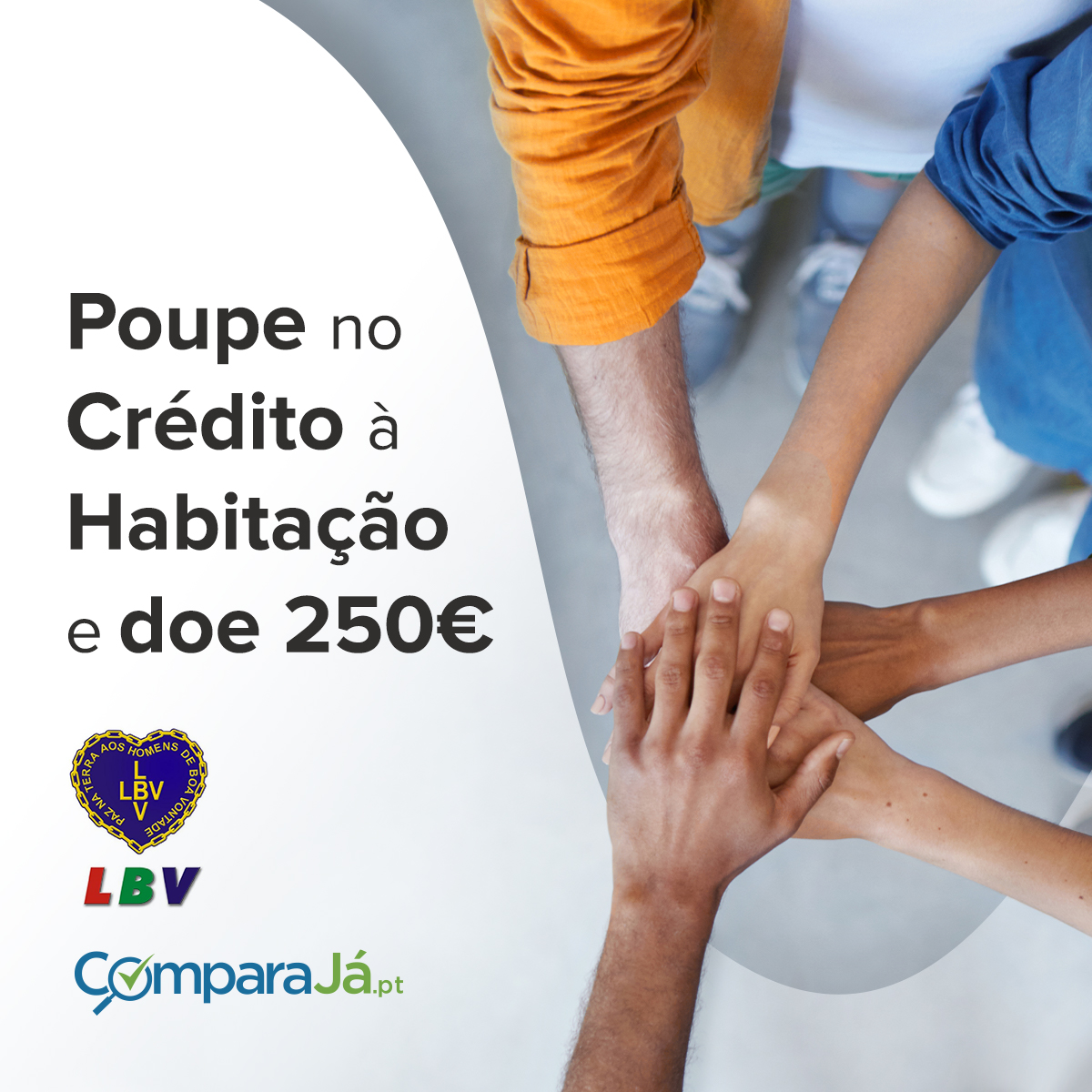 Nesta campanha, por cada crédito habitação que for financiado através do link especialmente disponibilizado pelo ComparaJá.pt no site da Legião da Boa Vontade, o ComparaJá.pt apoiar-nos-á com um montante de 250€. Nesse sentido, se for adquirir uma casa com recurso a crédito habitação ou, caso já possua um crédito e deseje transferi-lo, faça-o através de https://www.comparaja.pt/credito-habitacao. Reforçamos que deverá obrigatoriamente aceder através deste link.