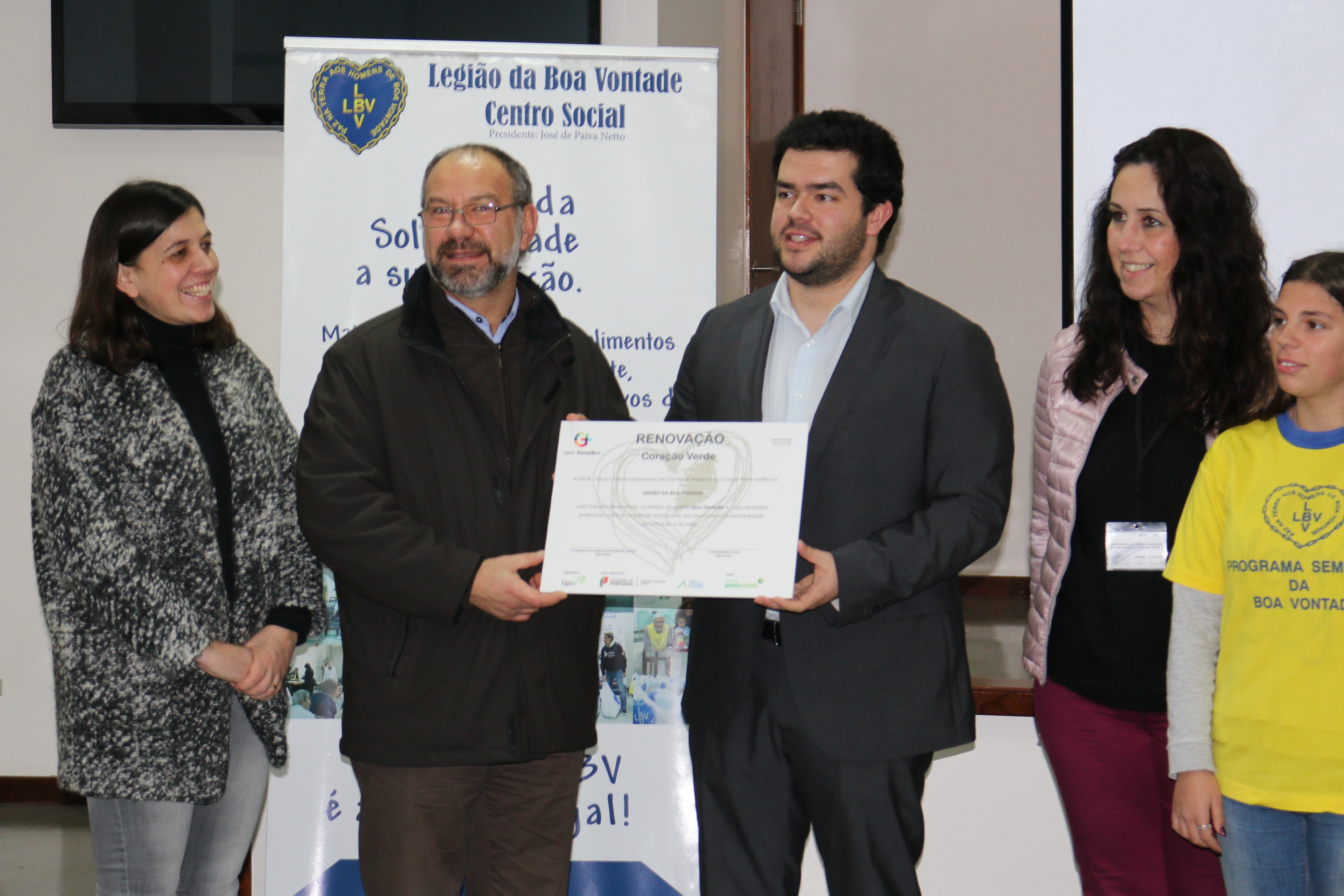 A Legião da Boa Vontade recebeu, dia 16 de fevereiro, a renovação do certificado “Coração Verde”, atribuído pelo projeto “Lipor Geração +”. O certificado, entregue à Instituição em 2015, distingue a LBV como uma promotora de boas práticas ambientais. O Dr. Daniel Freitas, assessor do Eng.º Filipe Araújo, Vice-Presidente Pelouro da Inovação e Ambiente, e a Dra. Luciana Rocha, da Lipor, estiveram na LBV e entregaram a Rogélio Braga, representante da Instituição, a renovação do certificado “Coração Verde”.