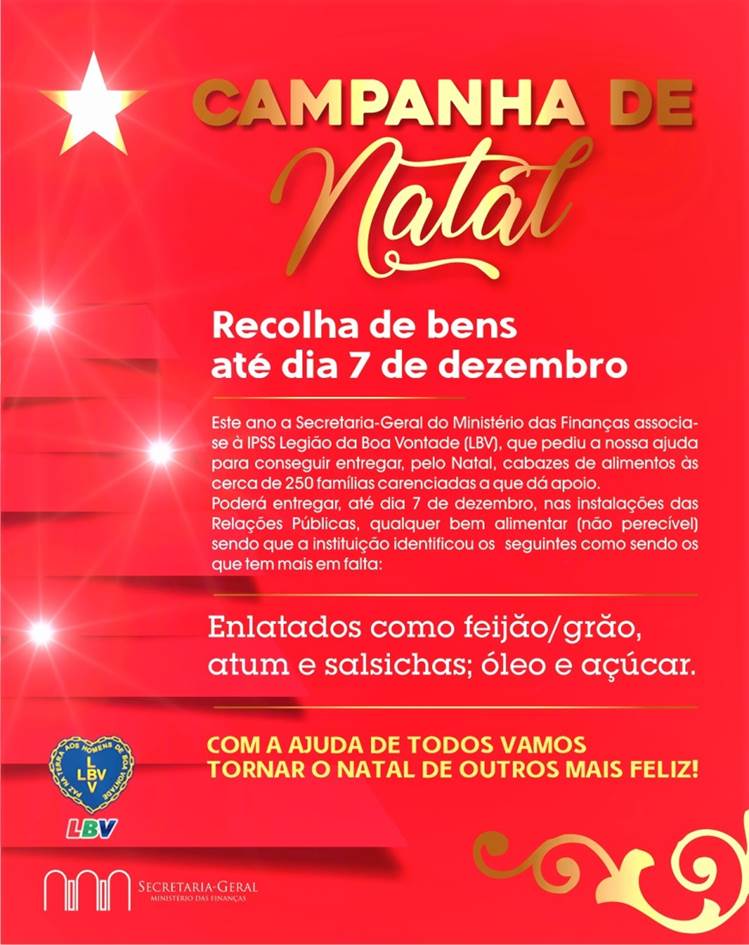 A Secretaria Geral do Ministério das Finanças está a recolher alimentos para serem incluídos nos cabazes de Natal que a Legião da Boa Vontade entregará na cidade de Lisboa, no dia 19 de dezembro.