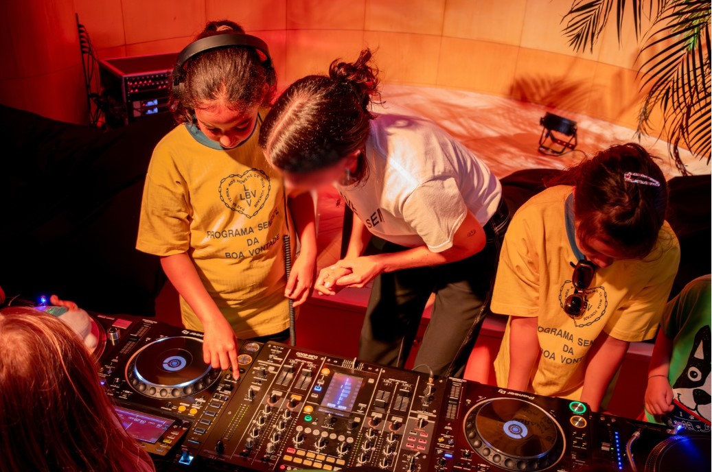 Após a sessão de cinema, foi aberta a Discoteca, na qual as crianças dançaram ao som de MVRIA, aprenderam a mexer nos pratos e a partilharem as suas escolhas e a sua música.