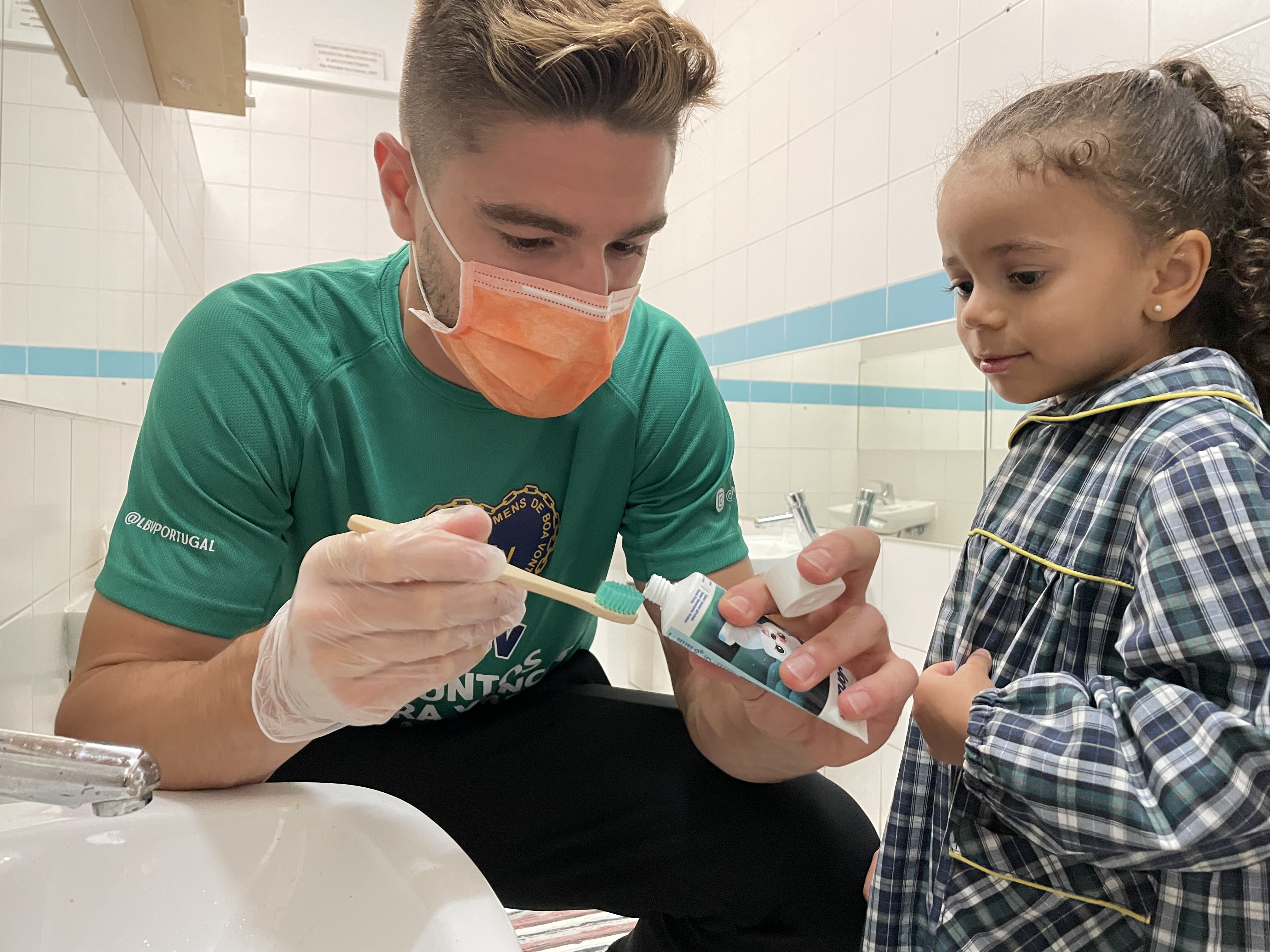Após as atividades lúdicas houve a realização da escovagem dentária com a colaboração do jogador Tomás Ribeiro, da voluntária Helena e da higienista oral, Beatriz Queirós. Nídia Elisa registou os preciosos momentos!
