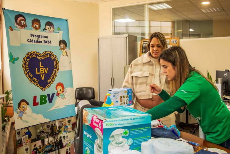A mamã vai ter o seu primeiro filho, o Lucas. Ao ver o enxoval que o Programa Cidadão Bebé da LBV preparou, emocionou-se com, como disse: “o tanto que a LBV está a dar”.