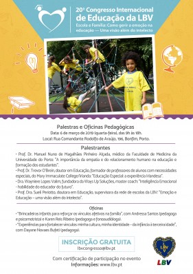 Sob o tema Escola e Família: Como gerir a emoção na educação — Uma visão além do intelecto, o evento reunirá professores, estudantes, profissionais das áreas da educação, psicologia, saúde e serviço social e interessados no assunto. As inscrições são gratuitas e devem ser feitas via e-mail: lbvcongresso@lbv.pt. Os congressistas terão direito ao certificado pelas horas de participação. Informações pelo tel.: (351) 22 208 6494.