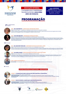 Na abertura do congresso, a dra. Elisabete Pinto da Costa, Pró-Reitora da Universidade Lusófona de Lisboa, saudará os congressistas, e na sequência acontece a palestra da dra. Suelí Periotto, doutora e mestra em Educação pela Pontifícia Universidade Católica de São Paulo (PUC-SP), superintendente educacional e supervisora da linha pedagógica composta pela Pedagogia do Afeto e pela Pedagogia do Cidadão Ecuménico, criada pelo saudoso educador Paiva Netto (1941-2025). Esta proposta é aplicada na rede de ensino e nas unidades socioassistenciais e humanitárias da Legião da Boa Vontade no Brasil e também nas unidades da LBV da Argentina, da Bolivia, do Paraguai, do Uruguai, de Portugal e dos Estados Unidos. Suelí ministrará a palestra inaugural do evento, com o tema do congresso “Educação Integral — Competências e Habilidades Socioemocionais: uma visão além do intelecto”.