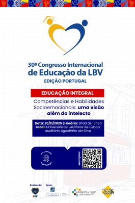 No próximo dia 20 de novembro de 2025, das 8h30 às 16h30, a cidade de Lisboa, em Portugal, sediará a 30ª edição do Congresso Internacional de Educação da LBV, que abordará o tema “Educação Integral — Competências e Habilidades Socioemocionais: uma visão além do intelecto”. A iniciativa, realizada pela Legião da Boa Vontade de Portugal, conta com o apoio da Universidade Lusófona — Centro Universitário Lisboa, que gentilmente cedeu o Auditório Agostinho da Silva para a realização do evento.