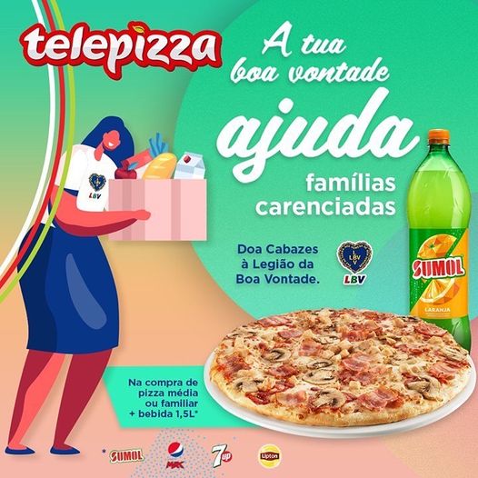 Sumol e Telepizza juntaram-se à Legião da Boa Vontade e estão a desafiar os consumidores a juntarem-se também a esta iniciativa de apoio às famílias carenciadas. Na compra de uma pizza média ou familiar e uma bebida de 1,5L (Sumol, Pepsi, Lipton ou 7Up), o consumidor deve ir ao microsite desenvolvido para o efeito e fazer o upload do talão de compra.